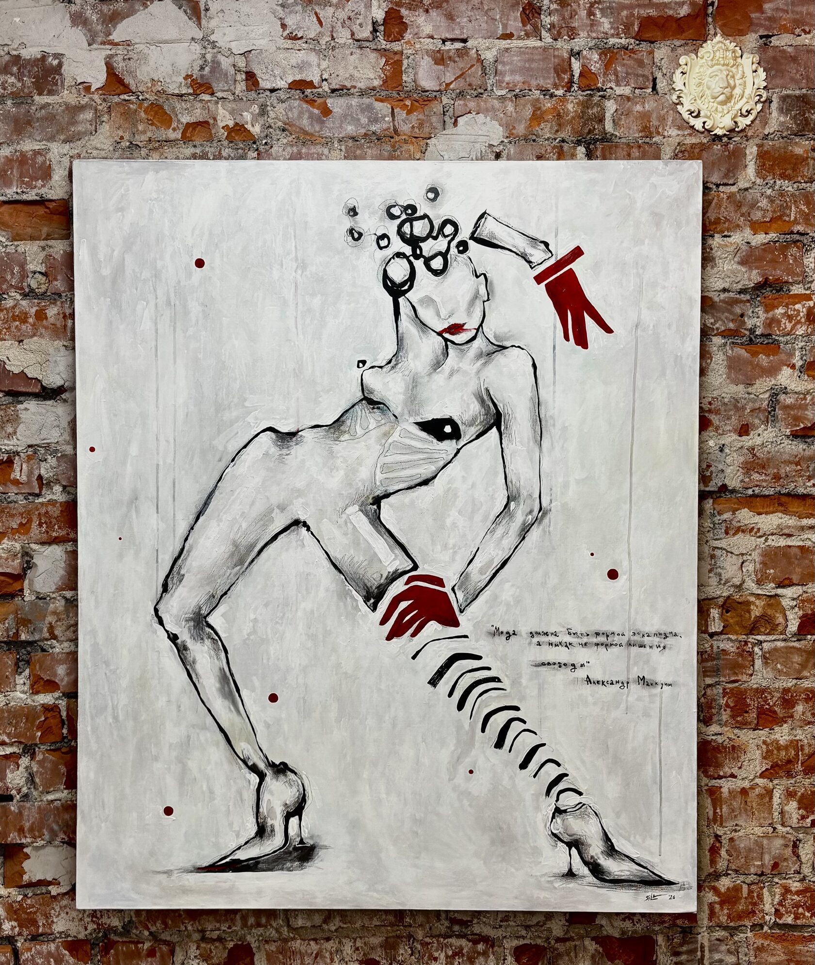 Эта работа про боль. Боль большинства людей, вхожих в индустрию моды. Каждая выпирающая кость под кожей — это не эстетика, а отчетливый след страданий. Это боль индустрии, превращающей человека в инструмент. Картина — о тех, кто стал живым манекеном, и о цене, которую они платят за культ худобы. Выпирающие ребра визуализируют внутреннее насилие над физиологией, доведенное до крайности в погоне за утопическим «идеалом». Шпильки — символ болезненной прикованности к этой системе. Отсутствие лица — финальный акт стирания индивидуальности. Через эстетизацию боли работа обнажает ее реальность.